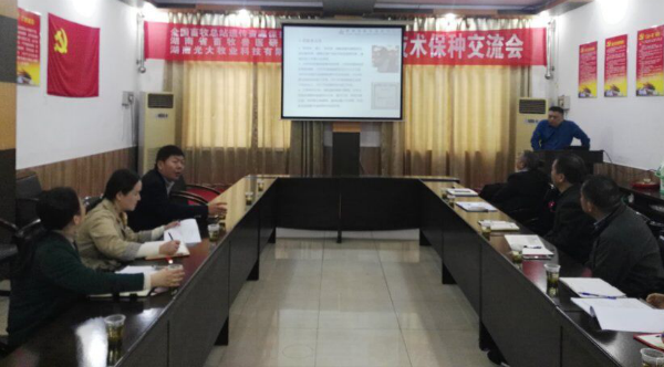 随后,就重点实验室考察情况召开汇报会。傅胜才所长、谢菊兰、周望平副所长及遗传育种、兽医、营养相关团队成员20人参加此次会议。彭英林总畜牧师从实验室自建立以来的团队概况、研究工作、相关成绩及服务交流四个方面进行了介绍,重点汇报了在与长沙市、县政府及企业合作致力打造宁乡花猪双百亿产业所做的工作与成绩。傅胜才所长介绍了我所在猪、牛、鸡的种质资源保护与开发方面的工作,目前已在“宁乡猪和大围子猪”开展了冻精、卵母细胞、颗粒细胞等保存利用研究及以宁乡猪为母本的杂交组合筛选工作,并就我所即将投入使用的新科研实验楼作了相关的介绍。