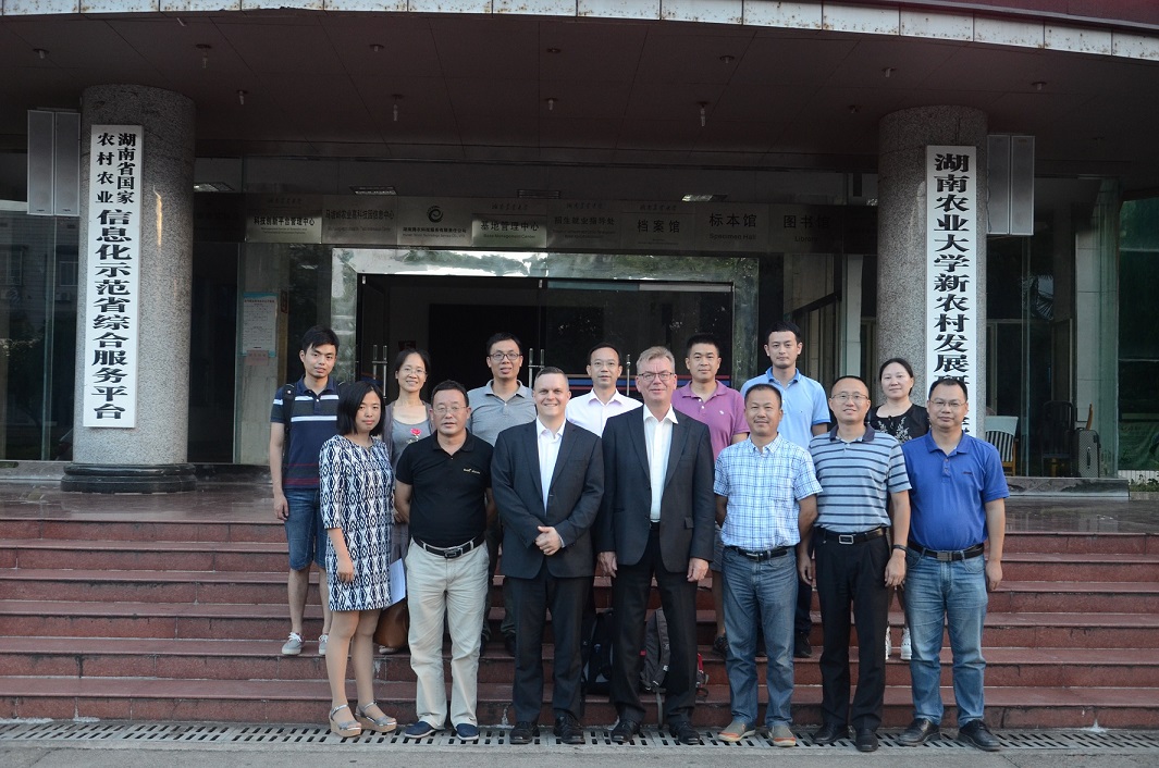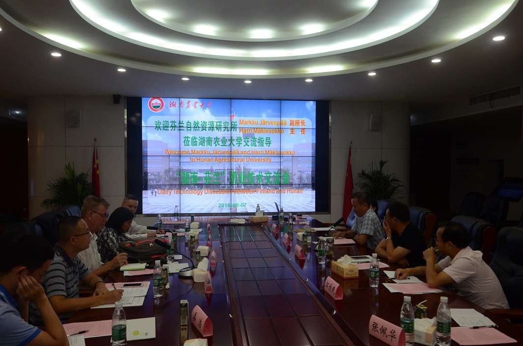 下午,双方共同出席了在湖南农业大学举行的“湖南-芬兰奶业技术交流会”,会议由湖南南山牧业有限公司发起,芬兰自然资源研究所、湖南省畜牧兽医研究所、湖南农业大学、湖南南山牧业有限公司等单位的相关专家参会。江为民副所长在交流会上介绍我所的草业与草食动物研究情况,易康乐研究员介绍了草食动物研究团队的研究工作特点和近期研究进展。Markku JärvenpääHarri Mäkivuokko分别介绍了芬兰自然资源研究所开展生物经济研究的进展和对湖南南山牧业有限公司合作项目关注点;南山牧业姚慧董事长报告了南山奶业发展与基地建设下一步需求。交流会上,与会代表就牧草种植、牛胚胎移植及提高营养物质利用效率,减少废气物排放等方面合作开展了讨论,专家们一致认为可以从城步南山牧草种植、品种筛选,提高牛乳与乳制品质量入手,逐步开展合作研究,希望以南山牧业为示范,推进湖南与芬兰在生物经济研究与发展的全方位合作。交流会由湖南农业大学动物科技学院贺喜副院长主持,湖南农业大学新农村发展研究院肖调义副院长致欢迎词,傅胜才所长对交流会进行了总结。