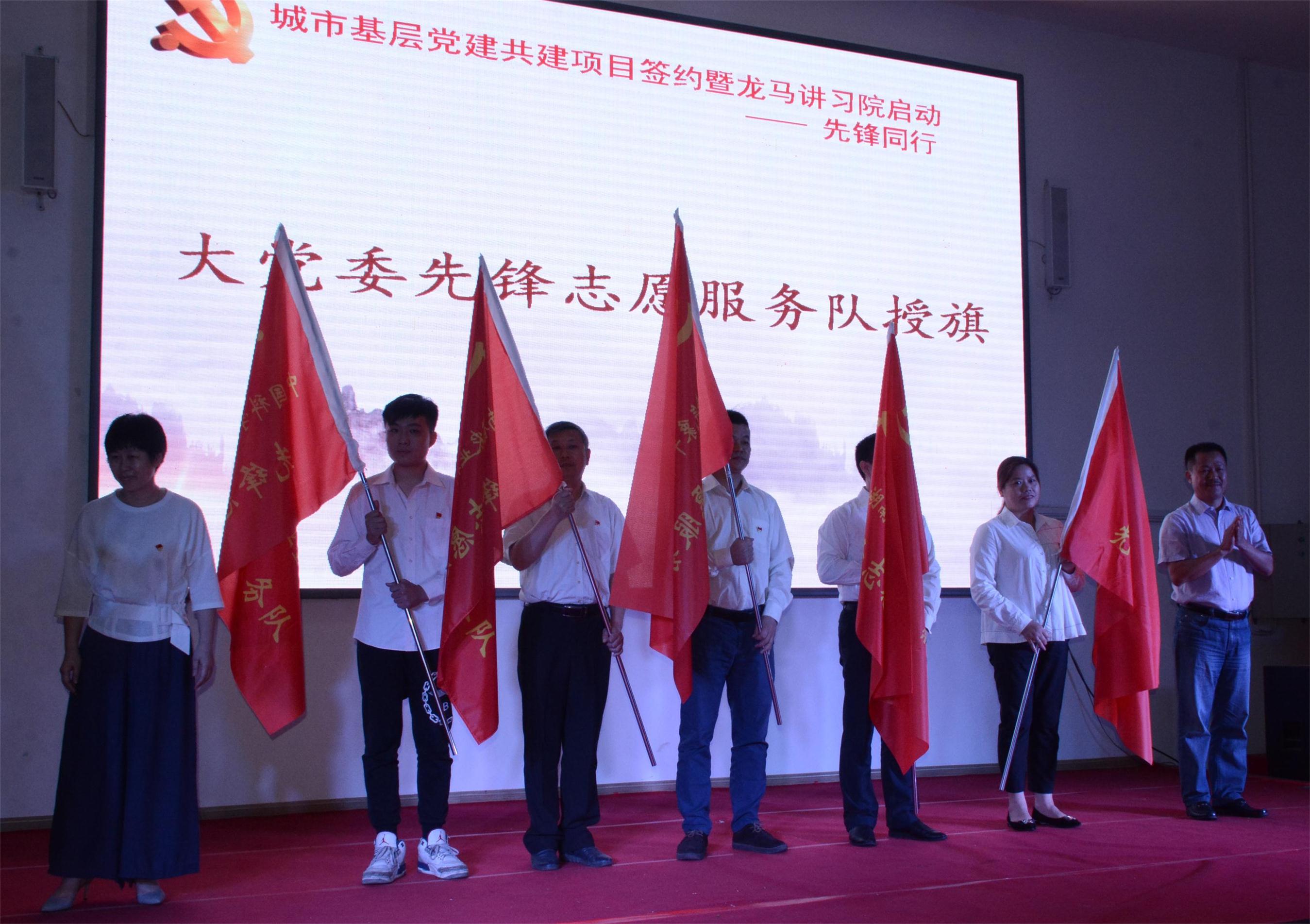 活动仪式上,柏连阳书记和周虔部长共同为“龙马讲习院”揭牌;社区大党委与6个单位现场签约2018年度城市基层党建共建项目;省畜牧兽医研究所青年服务队等6家单位被社区大党委授予先锋志愿者服务队称号;10人(省畜牧兽医研究所傅胜才1人)被“龙马讲习院”聘为专家讲习团讲师,16人(省畜牧兽医研究所陈晨、李新国、孙建帮、刘海林4名同志)被聘为专业讲习团讲师,并分别被授予聘书。傅胜才所长和肖秧琳副院长为驻区6家单位先锋志愿者服务队授予队旗。最后,柏连阳书记和周虔部长就“龙马讲习院”和城市基层党建共建工作分别做了讲话。