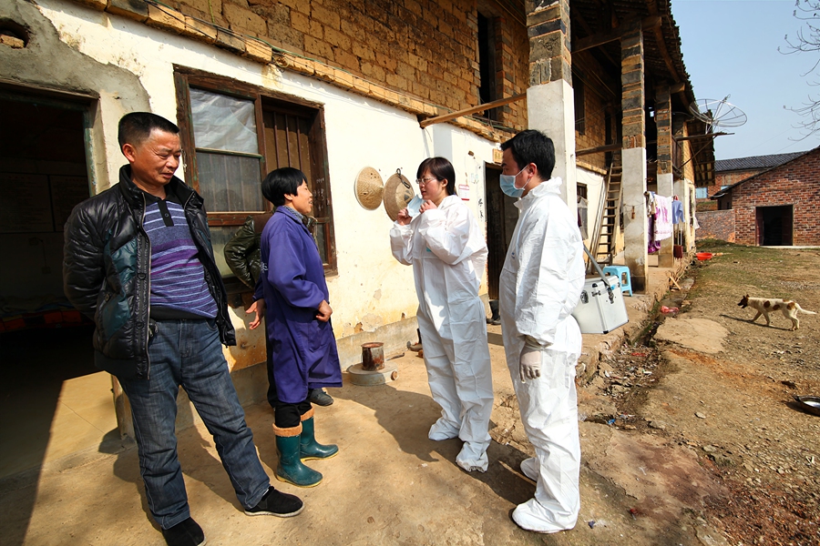 皮绍娣(右一)在养鸡场采样