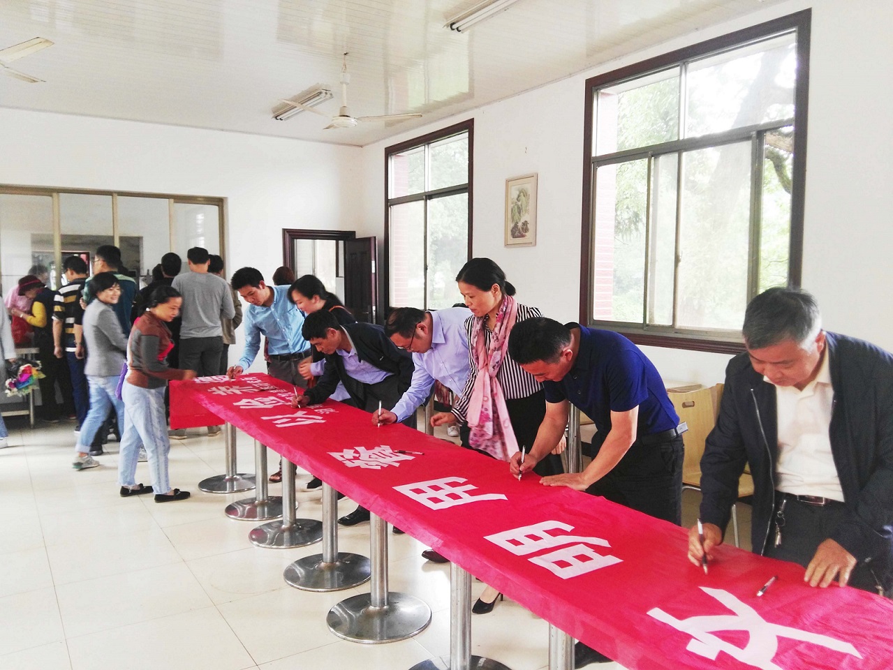 为倡导文明节俭用餐的良好风尚,进一步提升干部职工厉行节约的自觉性,5月10日中午就餐前,省畜牧兽医研究所组织80多名干部职工在职工食堂开展“文明餐桌”承诺签名活动,在“文明用餐 以俭养德”的横幅上签下了各自的名字,做出“文明用餐”的庄严承诺。