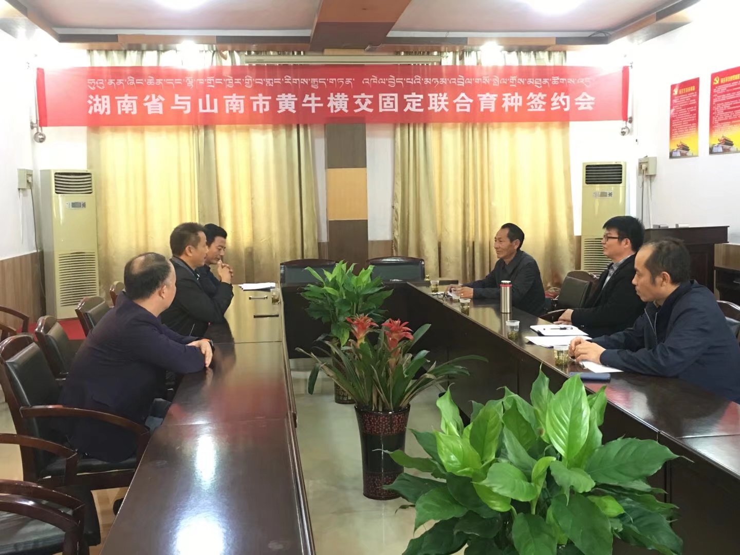 傅胜才所长指出,湖南省农委系统作为西藏山南市农牧局系统的对口支援单位,前后八批次选派了相关专业技术人才和管理干部到山南市开展援藏工作,效果显著,增进了湘藏两地的交流交融。这次联合育种项目又成功落户湖南光大牧业科技有限公司,这是湖南农业援藏的新思路和新举措,我所将按照省农委的统一安排和部署,发挥自身科技人才优势和科研实力,集中人员、技术、设备等资源,大力支持联合育种项目的实施,确保项目成功并取得实效,促进山南市黄牛改良事业快速、健康、科学、有序发展。下一步还将在专业技术援藏工作方面继续加强与西藏山南市畜牧兽医总站的合作,相互交流、加强合作、加深友谊,共同谱写湘藏农业交流交往交融的新篇章。