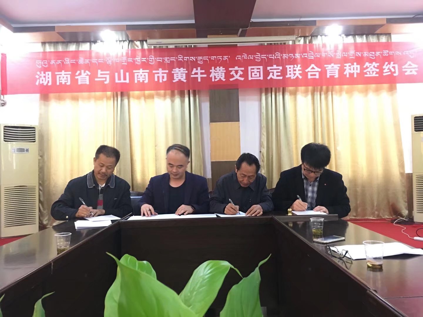 2017年10月30日下午,湖南省与西藏自治区山南市黄牛横交固定联合育种项目签约仪式在湖南省畜牧兽医研究所举行。省畜牧所所长傅胜才研究员、西藏山南市畜牧兽医总站站长格桑加措研究员、湖南光大牧业科技有限公司张翠永总经理三方共同签署了《山南.湖南黄牛联合育种协议》;任西藏农牧学院总顾问的中国农业大学张浩教授出席签约仪式;湖南省家畜育种工作站副站长张佰忠研究员主持本次签约仪式。