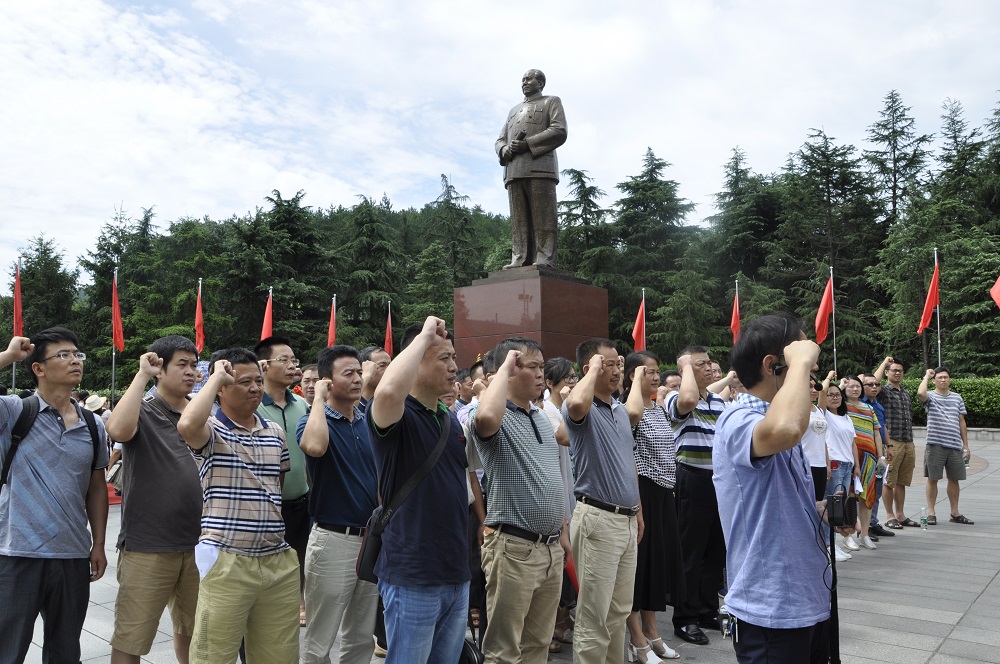 活动在缅怀中开始,全体党员来到毛泽东铜像广场,庄严地向毛泽东铜像鞠躬,表达了对伟人的敬仰之情。由党委委员、副处级纪检员江为民同志领誓,全体党员郑重举起右手,面向党旗,庄严宣誓。