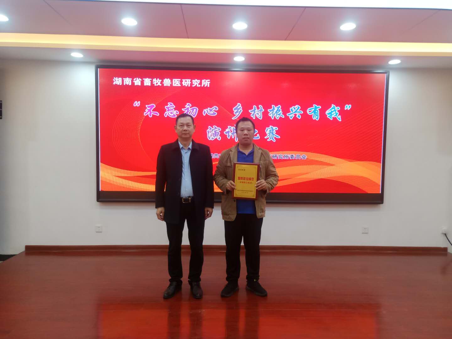 通过全体与会人员对爱岗敬业模范候选人进行投票评选,高帅同志获得了2020年度湖南省畜牧兽医研究所爱岗敬业模范(文明职工标兵)荣誉称号。宋武同志当场为高帅同志颁授爱岗敬业模范(文明职工标兵)奖牌。