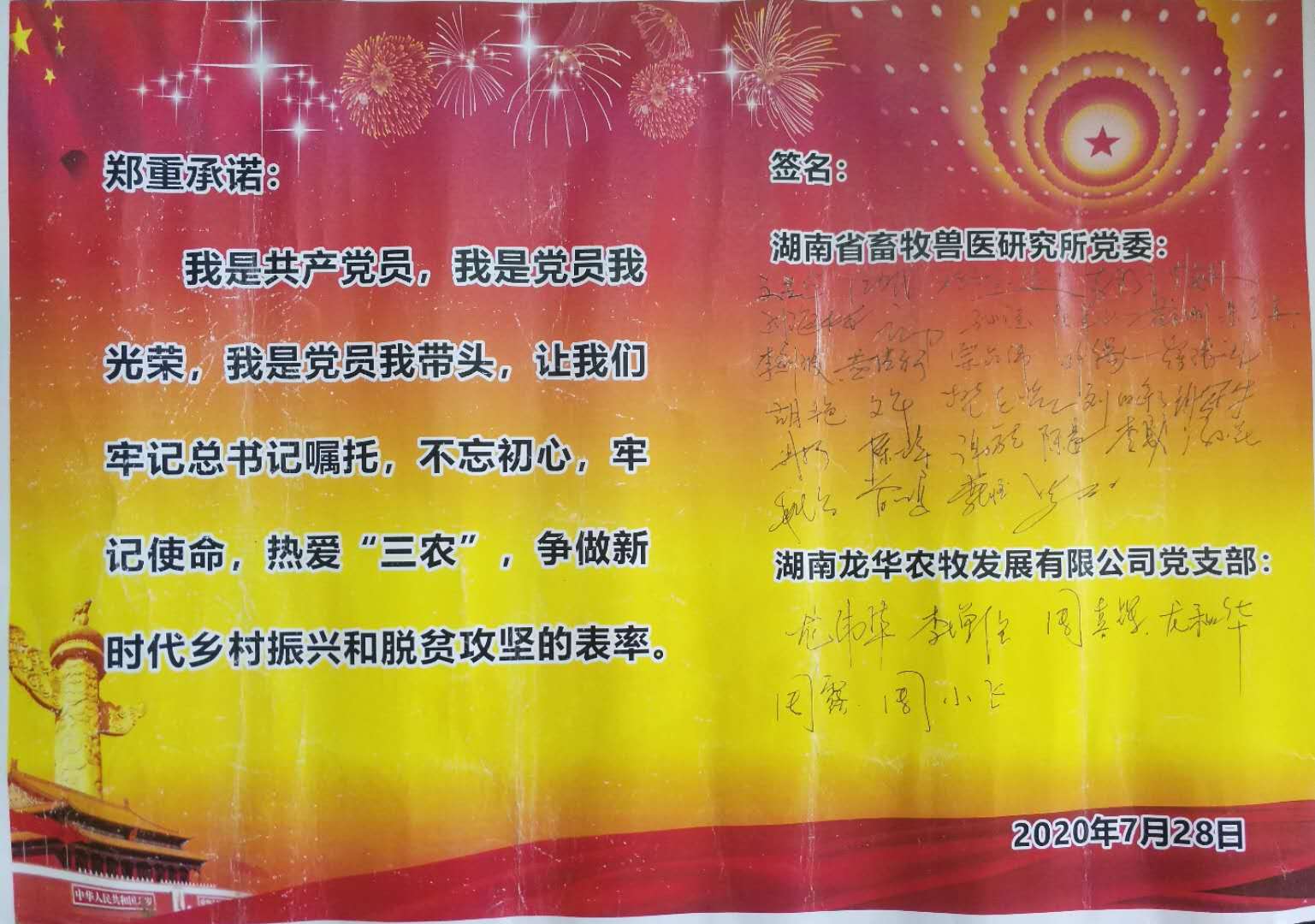 “我是共产党员,我是党员我光荣,我是党员我带头,让我们牢记总书记嘱托,不忘初心、牢记使命,热爱三农,争做新时代乡村振兴和脱贫攻坚的表率”,所里全体党员和公司的党员在承诺书上郑重签名承诺。