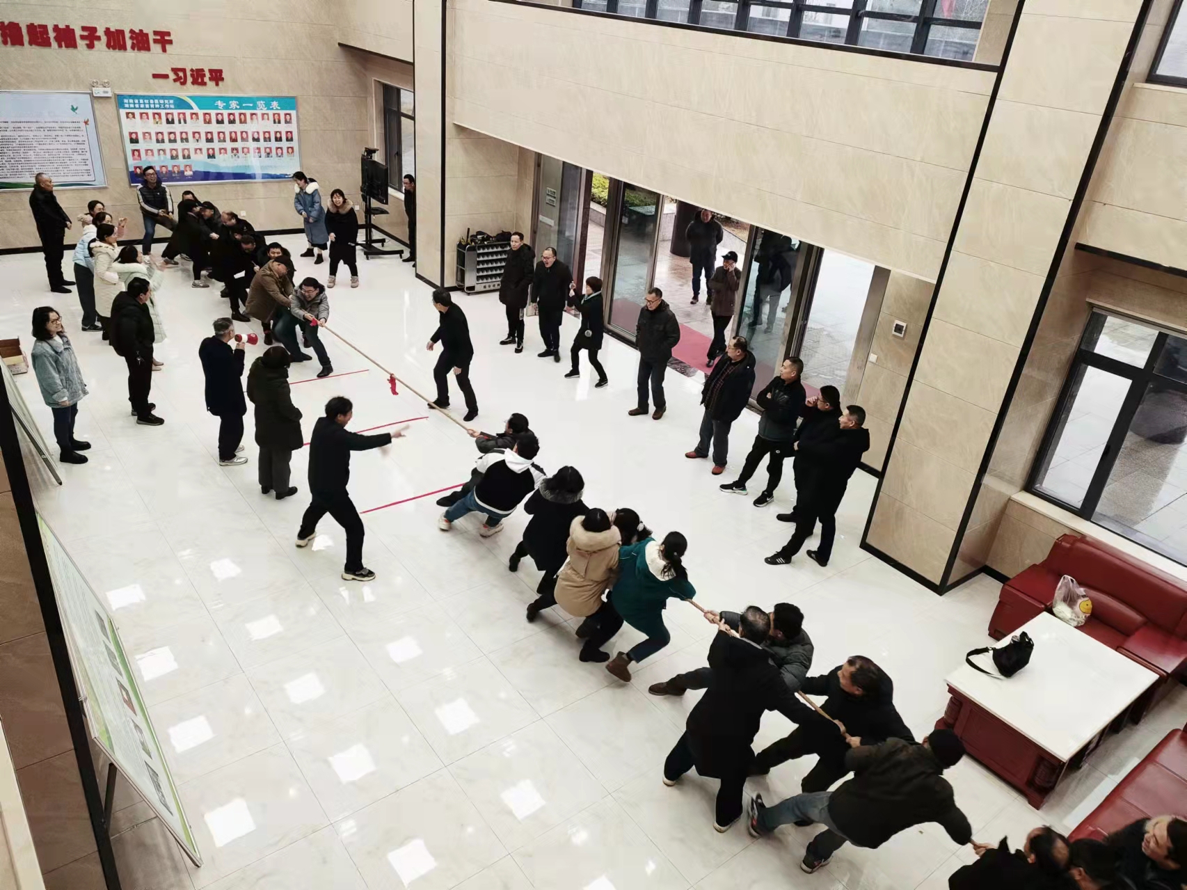 运动会共分为拔河、羽毛球赛、乒乓球赛三个项目。上午9点,拔河比赛正式开始,以工会小组为单位每队10人参赛,全组会员轮流上场参赛。当比赛的哨声响起,只见参赛的队员们紧握长绳,卯足了劲拼命往后拉!经过努力拼搏,第三工会小组获得拔河比赛冠军。