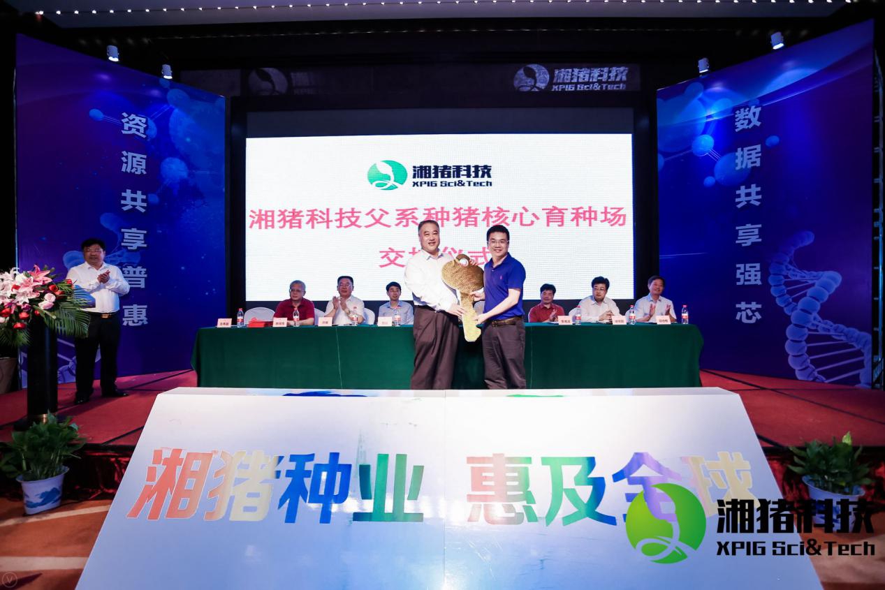 开幕式上,还进行了湘猪科技父系核心育种场“金钥匙”交接仪式。湘猪科技落户湖南省畜牧育种产业园,前期由湖南天心种业股份有限公司承建。天心种业万其见总经理向湘猪科技董事长袁金锋博士交接了“金钥匙”,象征着湘猪科技扬帆起航的第一步顺利完成。