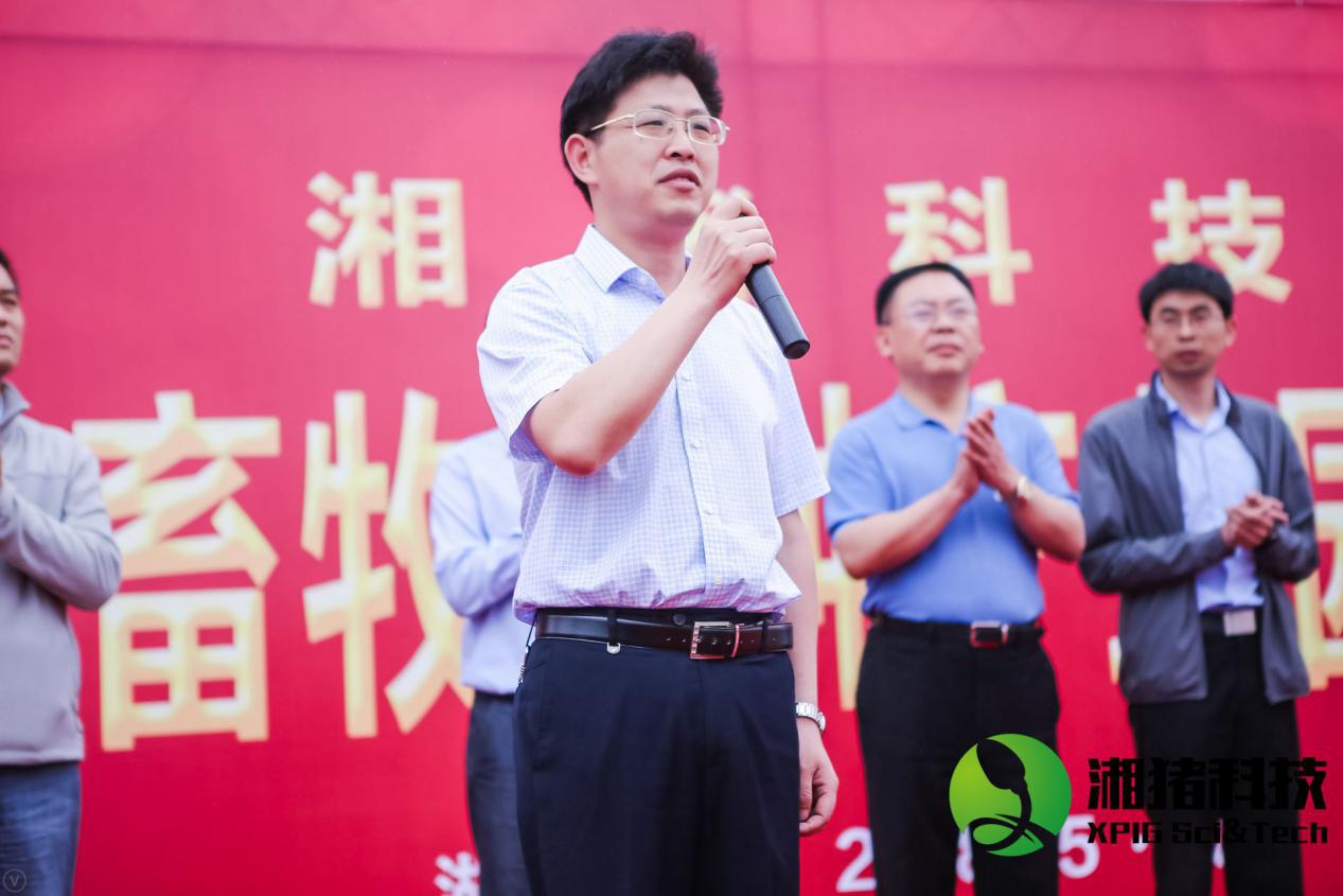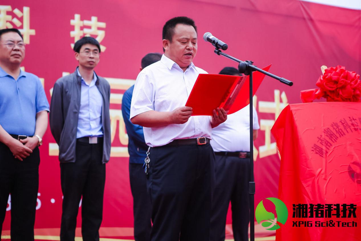 农业农村部畜牧业司畜牧处副处长曾珉先生,湖南省现代农业产业控股集团党委书记、董事长许维先生;湖南省畜牧水产局总工程师邱伯根,株洲市畜牧兽医水产局局长丁石春,株洲市畜牧兽医水产局副局长董艳德,攸县人民政府副县长周文安先生,湖南省畜牧兽医研究院研究员彭英林,湖南省畜牧水产局畜牧处调研员孙立荣先生,湖南天心种业股份有限公司党总支书记、董事长刘艳书等领导和嘉宾共同见证了“湖南湘猪科技股份有限公司”的揭牌。