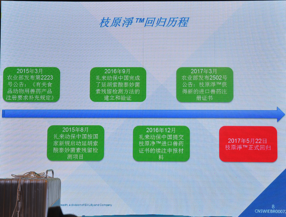 2016年9月,礼来动保中国完成了延胡索酸泰妙菌素残留检测方法的建立和验证。与此同时(2016年9月1日),由于续注进口证书需时超出预期,礼来动保中国不得不宣布暂停枝原净TM所有包装规格产品的供应;