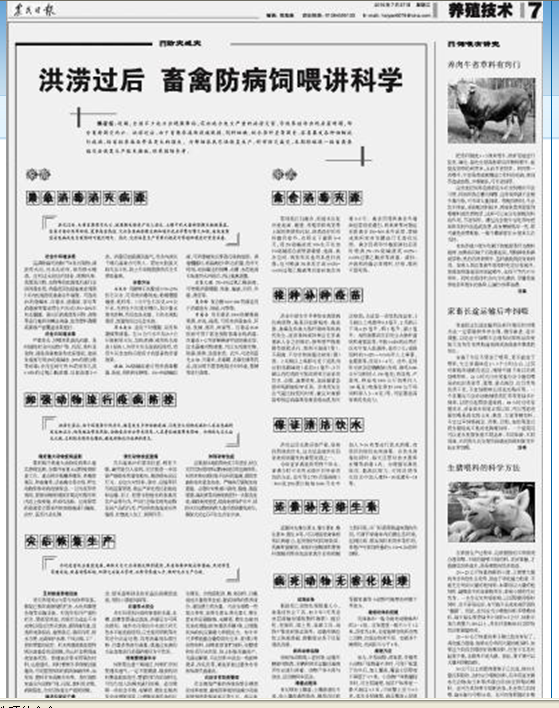 7月27日,《农民日报》第7 版以3/4个版面特别刊发了我局制订的畜牧渔业灾后生产恢复技术指导措施,以指导全国畜牧渔业抗洪救灾工作。