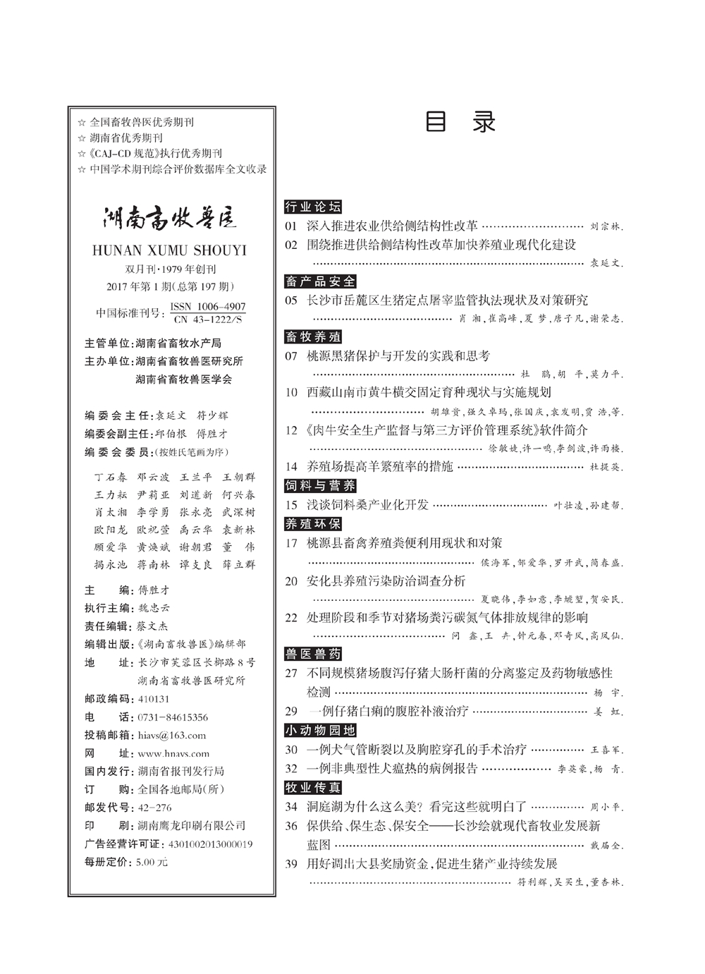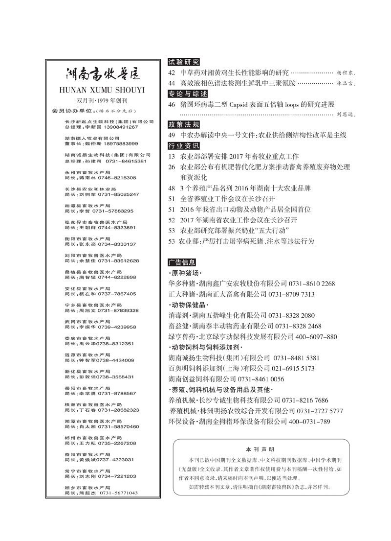 《湖南畜牧兽医》杂志2017年第1期文章目录