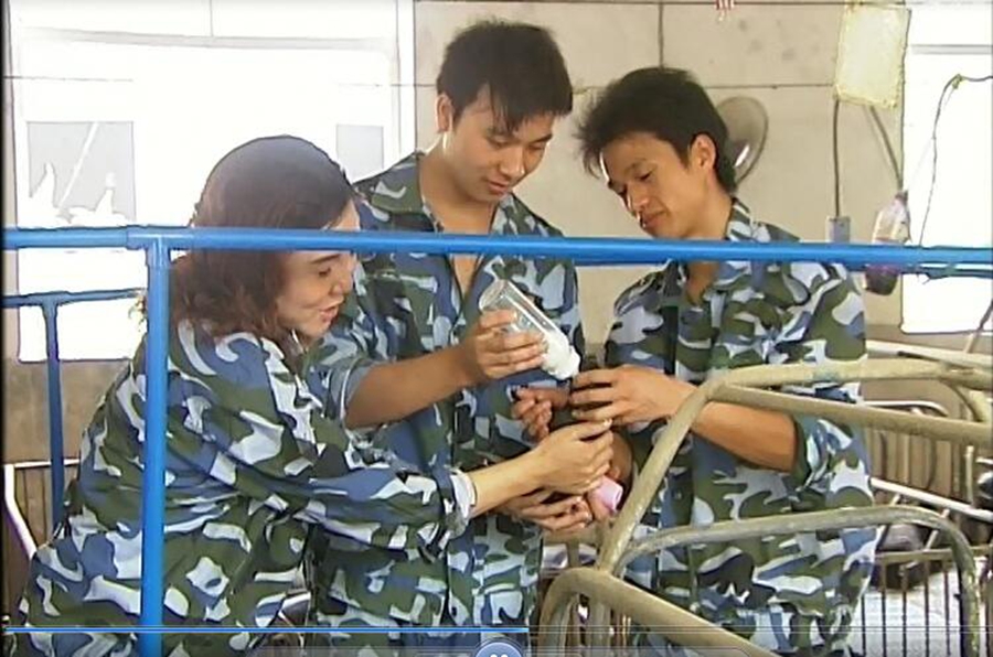 △ 杨文莲(左一)在猪场技术指导