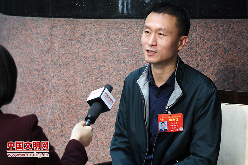 全国人大代表、中国航天科技集团科技有限公司第四研究院高级技师徐立平接受中国文明网采访。中国文明网 邓植尹 摄