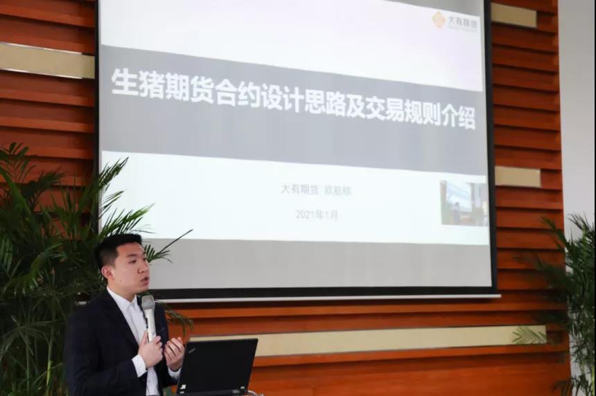 大有期货投研中心高级研究员欧航棋做《生猪期货合约设计思路及交易规则介绍》分享,精准诠释生猪期货总体设计理念,详细解读生猪期货合约文本,分析解读生猪期货风险管理制度;并在此基础上提炼出生猪期货的六大产业应用价值:有利于发现价格,重塑定价模式;通过套期保值,锁定成本及收益;通过期货市场进行计划养殖管理;助力企业规模化发展,提高行业地位;申请交割库,提高品牌知名度;“保险+期货”助力企业加速发展。