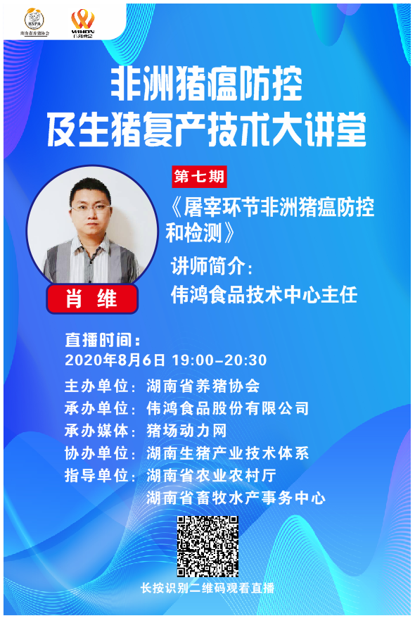 2020年8月6日晚7点,由湖南省养猪协会举办的“非洲猪瘟防控与生猪复产经验交流”第七期网络培训在猪场动力网直播平台准时开播。本期主讲人伟鸿食品股份有限公司技术中心主任肖维,分享的题目是《屠宰环节非洲猪瘟防控和检测》。