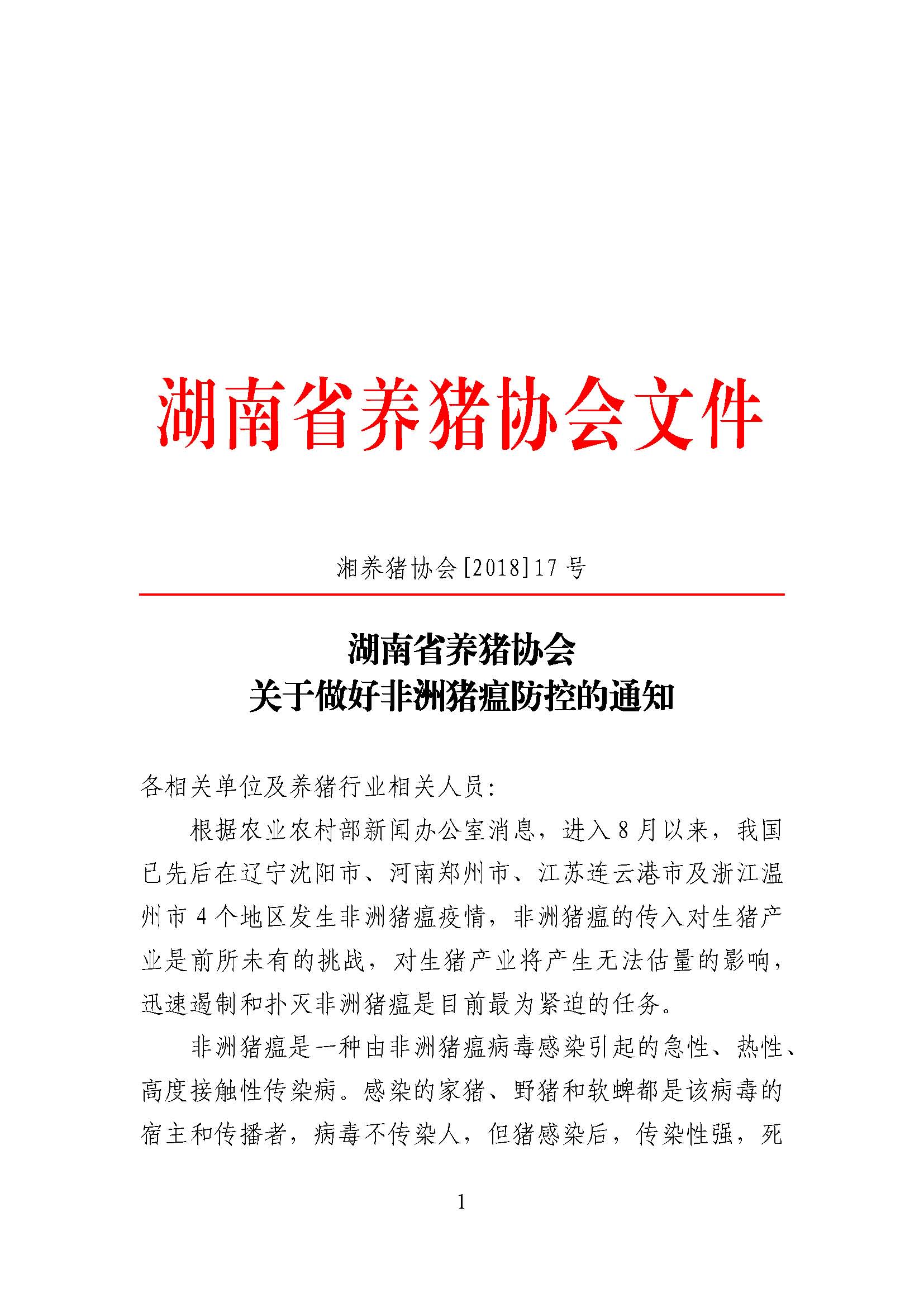 湖南省养猪协会关于非洲猪瘟防控的通知