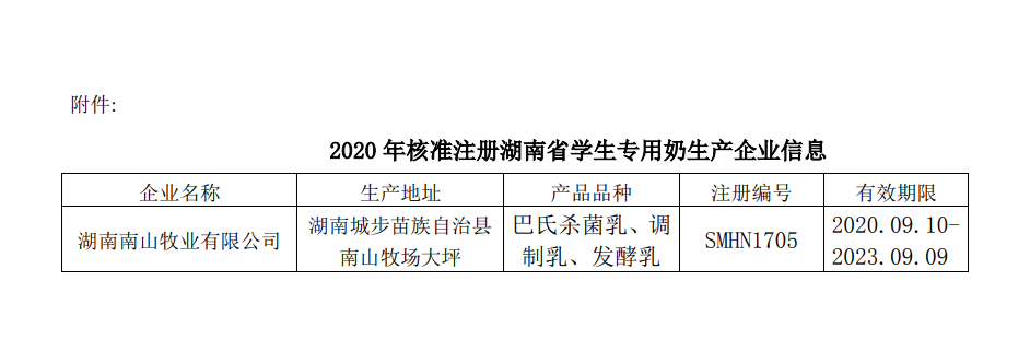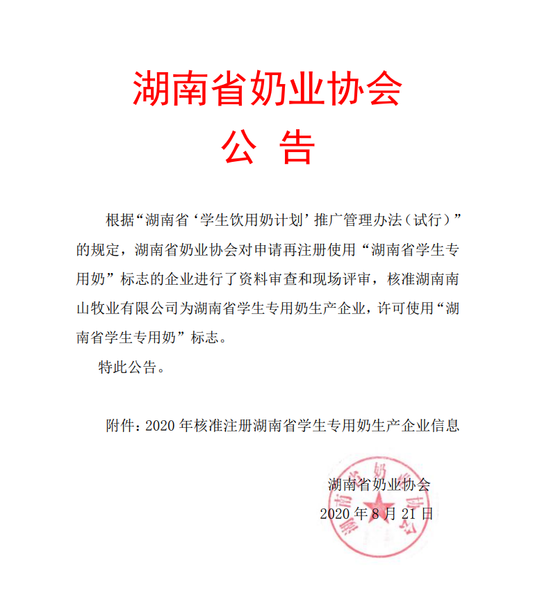 关于湖南省奶业协会核准湖南南山牧业有限公司为湖南省学生专用奶生产企业的公告