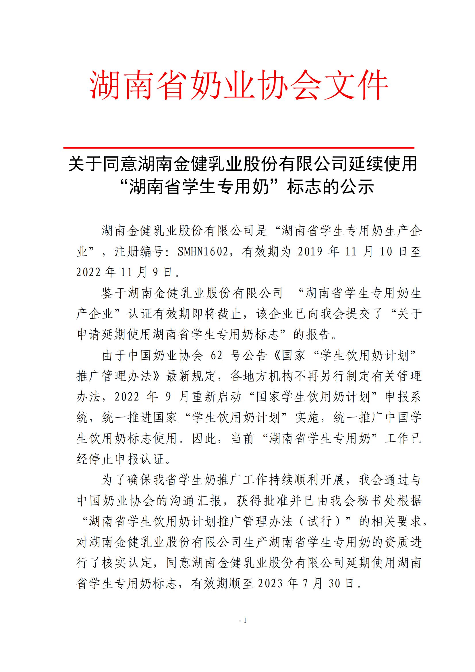 关于同意湖南金健乳业股份有限公司延续使用“湖南省学生专用奶”标志的公示