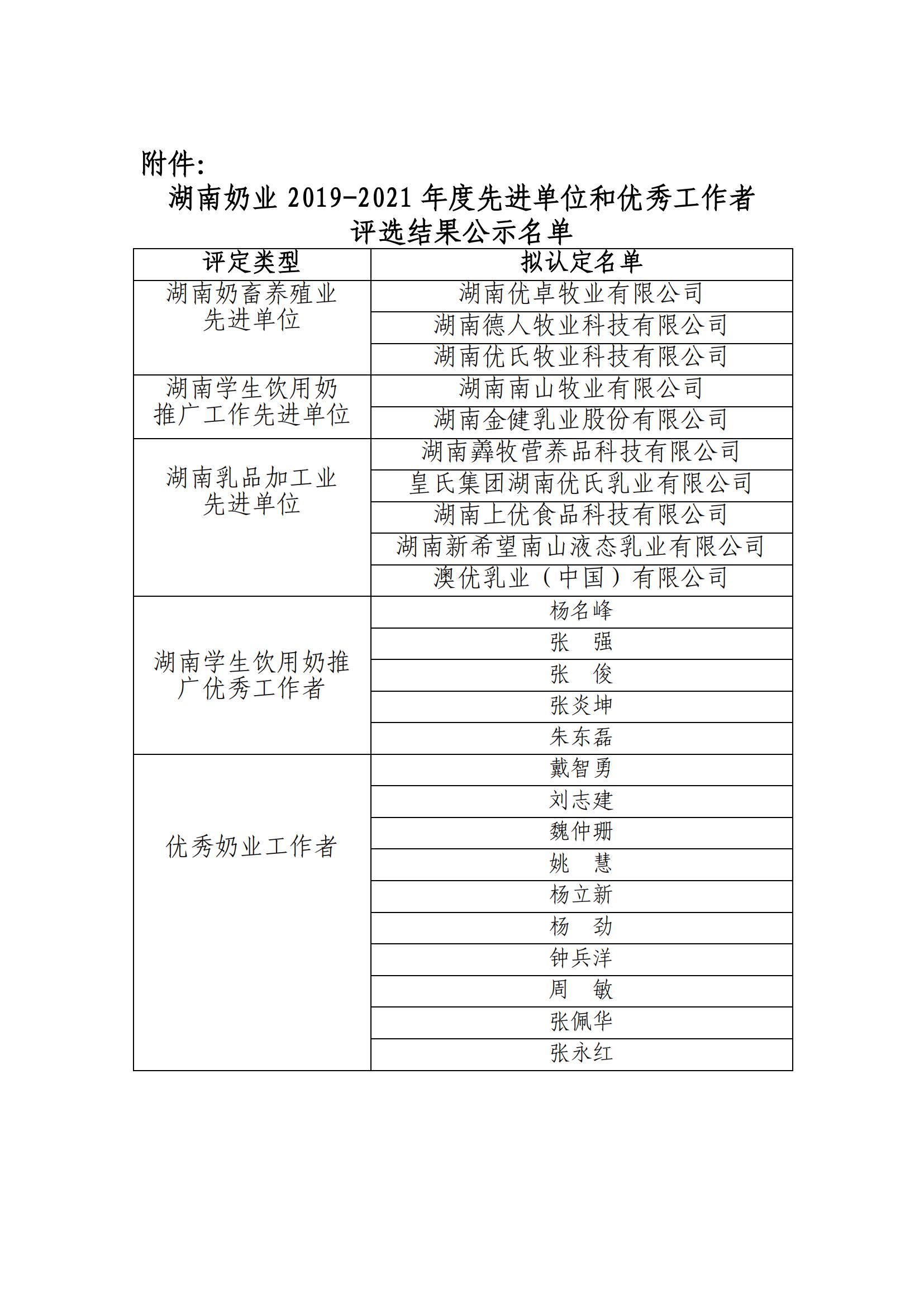 关于开展湖南奶业2019-2021年度“评选评优”评选结果的公示