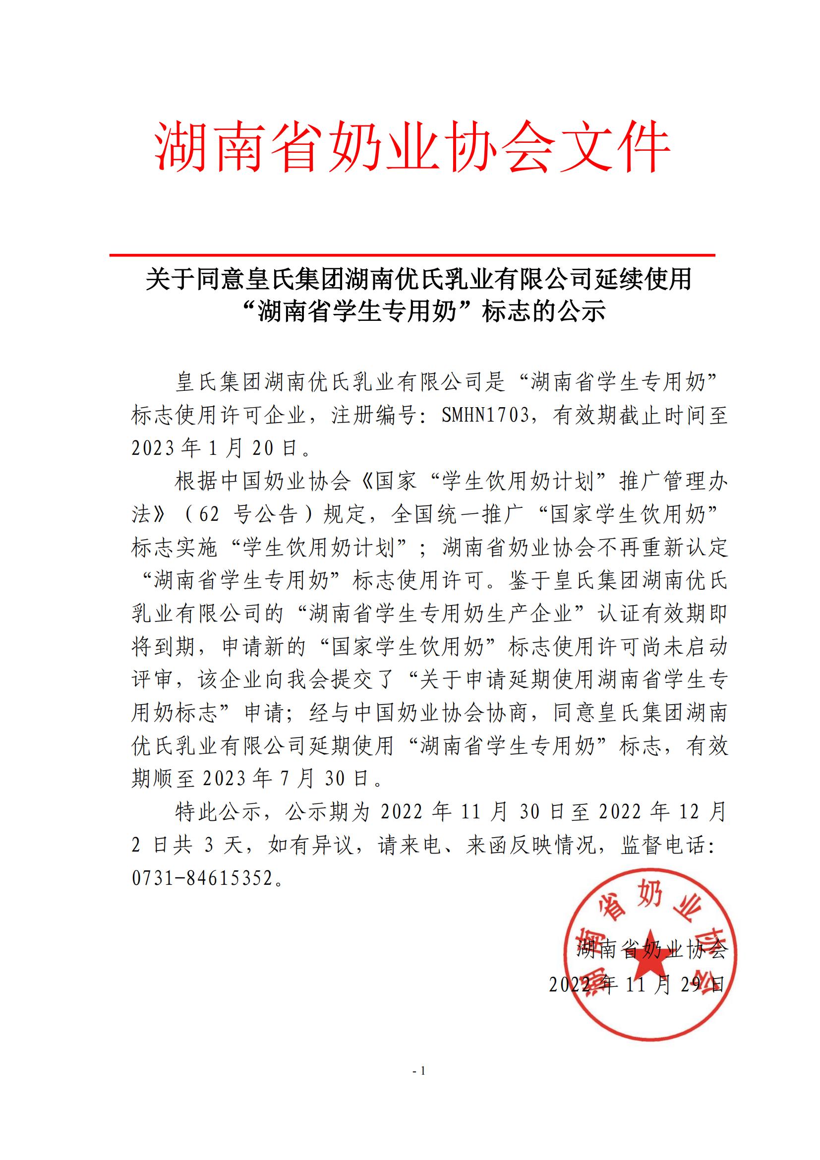 关于同意皇氏集团湖南优氏乳业有限公司延续使用“湖南省学生专用奶”标志的公示